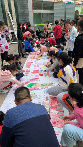 活动中,小朋友们表演了非洲鼓、弹吉他、唱歌、跳舞等节目,并自由参与了许多小游戏,志愿者们与孩子们打成一片,在友好互动中建立了良好的关系。在活动的最后,大家一起携手共同创作了一幅长卷画以庆祝建党100周年。