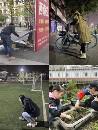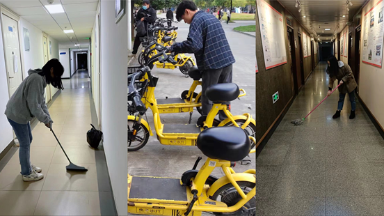 我为师生办实事,保护校园环境人人有责。针对校园停车点乱停乱放、校园卫生问题,支部不少同志主动担当起校园环境保护大使。支部任凌霄同志在中午学生集中回宿舍时段,将共享单车归置到停车点,进行重新摆放;支部王源绿同志见学院办公区走廊出现明显油渍,主动参与清洁;支部蒋文多同志考虑到疫情期间,宿管阿姨要职守楼道,事务繁多,就主动打扫楼道,为生活区营造良好环境。