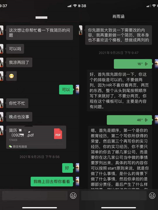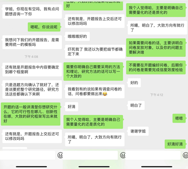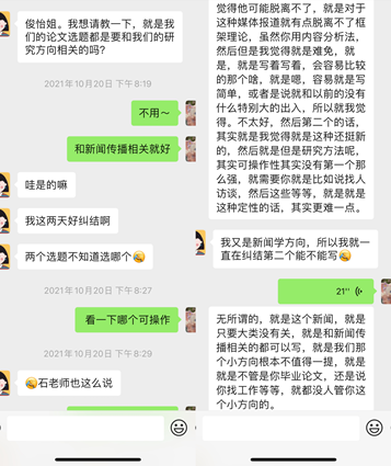 我为师生办实事。帮助学弟学妹答疑解惑。作为研三支部,在论文写作、专业实践等方面支部成员积累了一定的经验。支部成员主动帮助研一、研二的同学,助力他们更好的丰富研究生生活。支部同志肖俊怡、冷宇,指导研二同学开题,分享自己的开题经验,对他们的选题、研究方法等提出建议。拥有丰富实习经验的张翰尹同志,在线上对学妹的简历进行指导,帮助其更快找到实习公司。